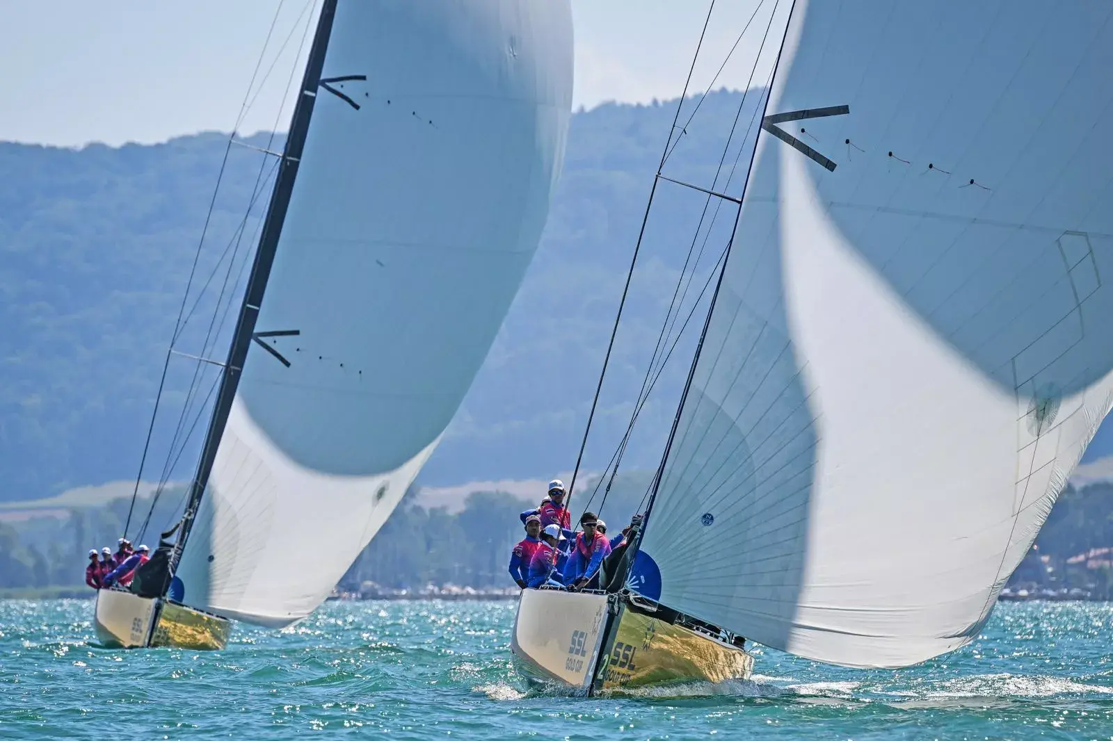 It can be 8, 9, or 10 sailors onboard, depending on the total weight (max 730kg) and wind conditions. The positions are: Helm/Skipper, Bow, Mid-Bow, Pit, Grinder, Trimmer, Main Trimmer, Tactician, and Floater. The Captain’s role goes beyond team selection and can also involve sailing. In the SSL Gold Cup and SSL qualifiers, there are four boats (teams) in one race.